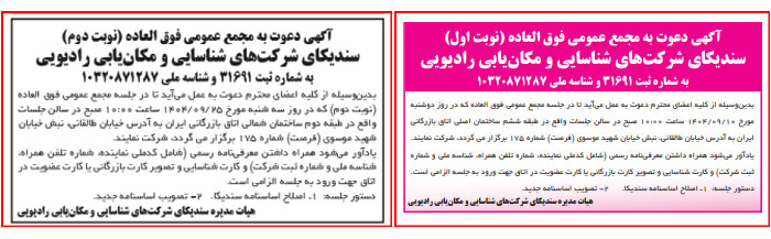 نوبت اول مجمع عمومی فوق العاده سندیکای شرکت های شناسایی و مکان یابی رادیویی و تجهیزات نقشه برداری (شناسا) در تاریخ دهم آذر ماه 1404 برگزار شد که بدلیل نرسیدن به حد نصاب اعضای واجدالشرایط رای، موضوع صورتجلسه شده و به امضای حاضرین رسید و با هماهنگی اتاق بازرگانی، صنایع، معادن و کشاورزی ایران، مقرر گردید تا نوبت دوم مجمع عمومی فوق العاده این سندیکا با رعایت مفاد اساسنامه برگزار شود.